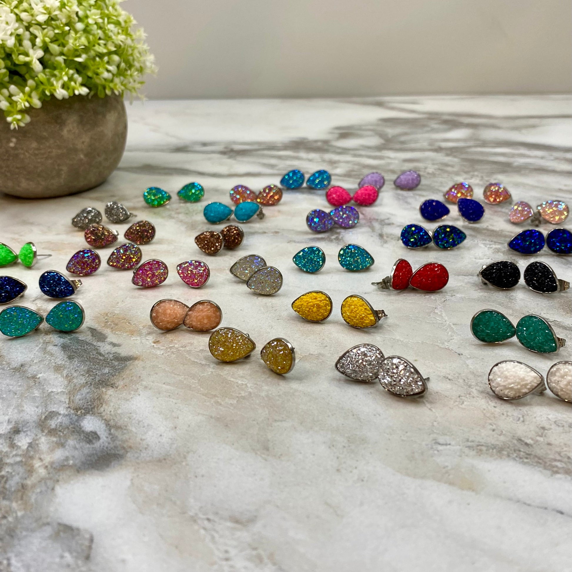 These druzy teardrop studs are a fun addition to any outfit! Sold as one pair and randomly selected from the above. Approx 3/4”