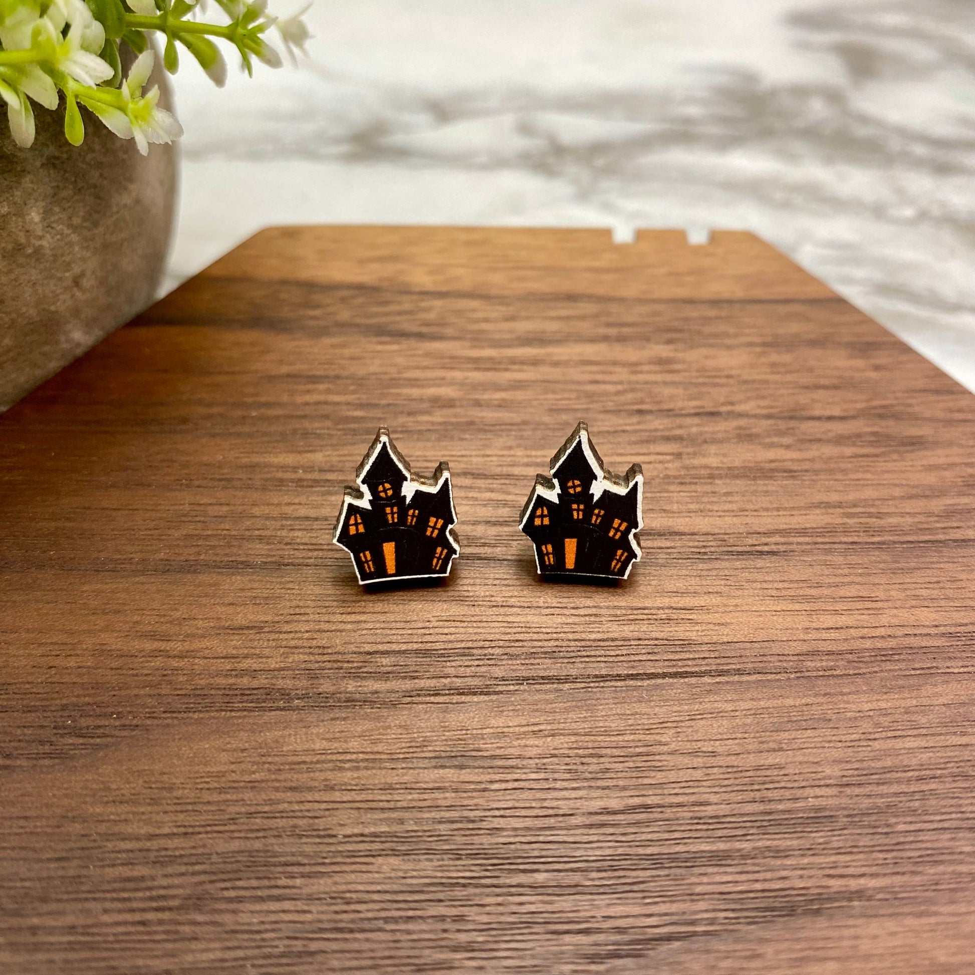 Wooden Stud Earrings - Halloween - Haunted House