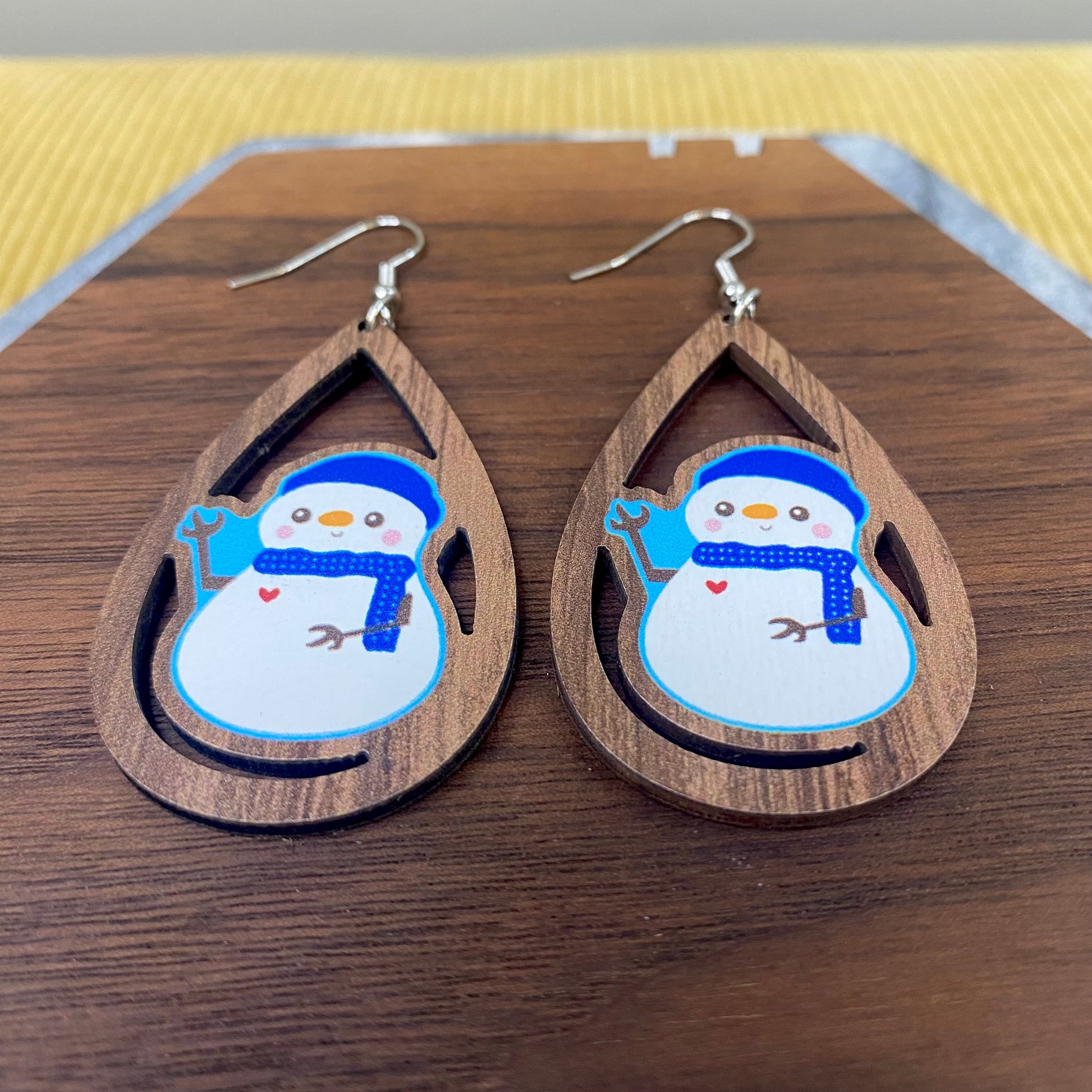 Wooden Teardrop Cutout Earrings - Winter - Snowman